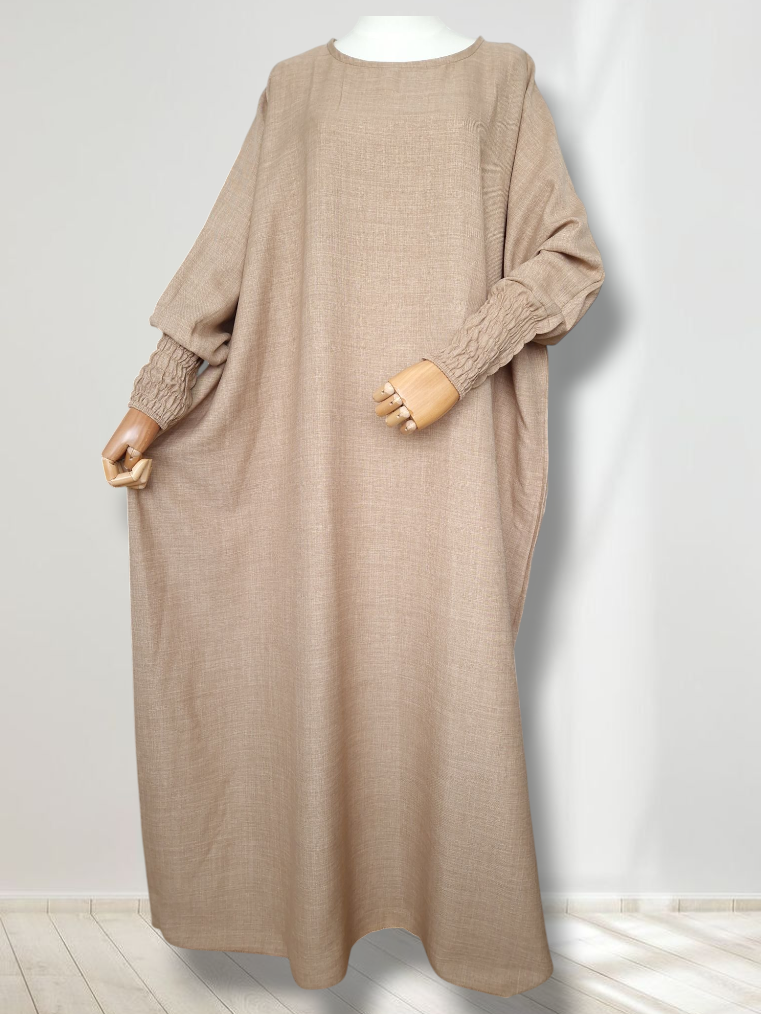 Diese Abaya überzeugt mit raffinierten, gerafften Ärmeln und einem etwas dickeren Stoff, der sich perfekt für die Übergangszeit im Frühling und Herbst eignet. Sie ist nicht nur angenehm zu tragen, sondern auch gut bedeckend und betont nicht die Körperfigur – ideal für einen eleganten, zeitlosen Look.