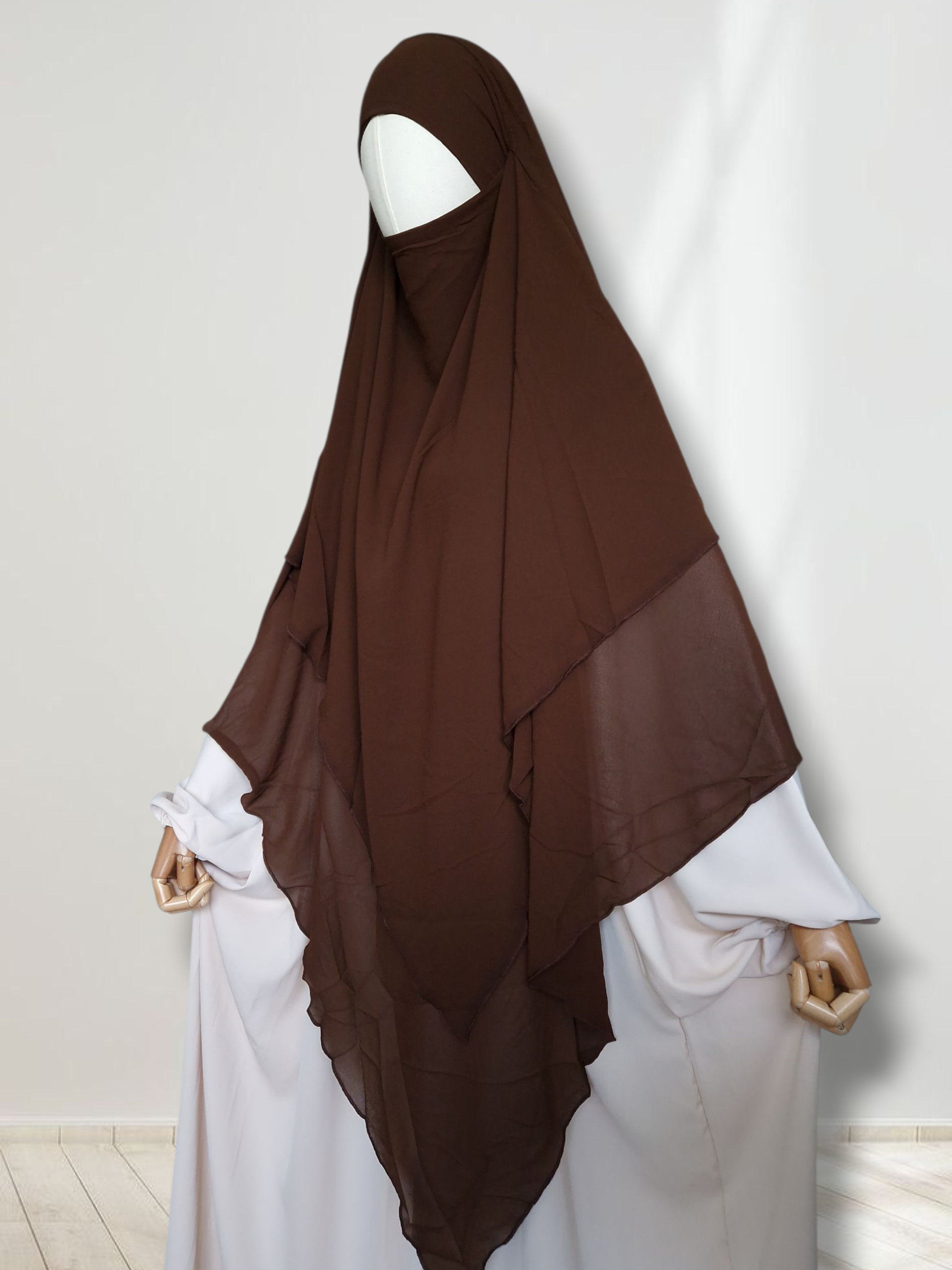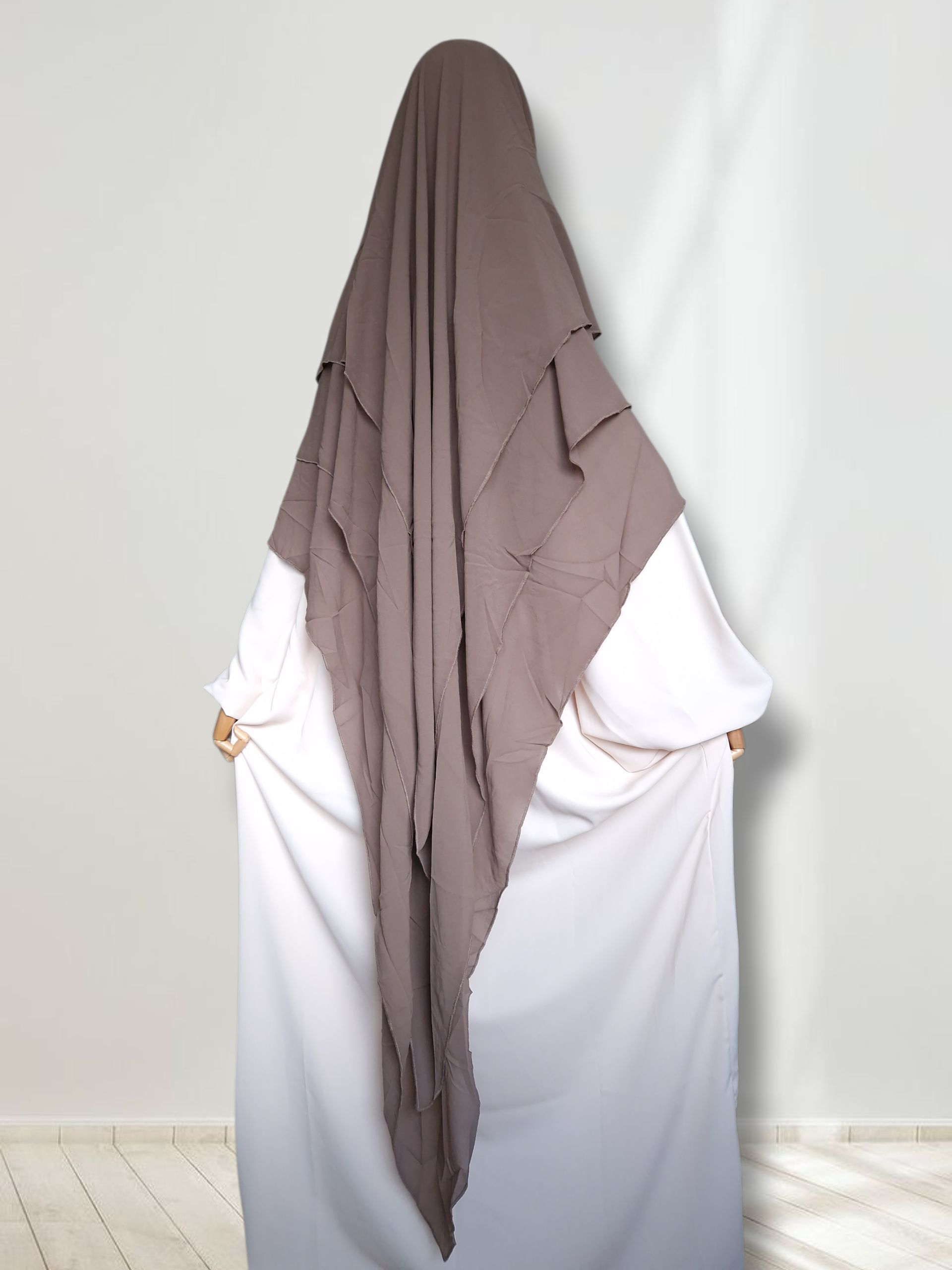 Entdecken Sie jetzt unseren dreilagigen Khimar aus hochwertigem Chiffon! Mit drei üppigen Lagen sorgt unser Khimar für eine wunderschöne Drapierung und Bewegungsfreiheit, während es gleichzeitig einen Hauch von Eleganz verleiht. Die leichten Stoffe machen ihn ideal für wärmere Tage, während er gleichzeitig ausreichend Abedeckung gewährleistet.